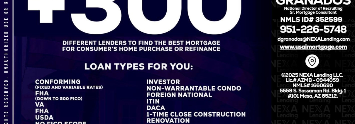 300+ LENDERS - David Granados -National Director of Recruiting / Senior Mortgage ConsultantHi, my name is David Granados. I’m a Loan Officer with NEXA Lending LLC., offering personalized mortgage solutions, fast customized quotes, great rates and service with integrity.