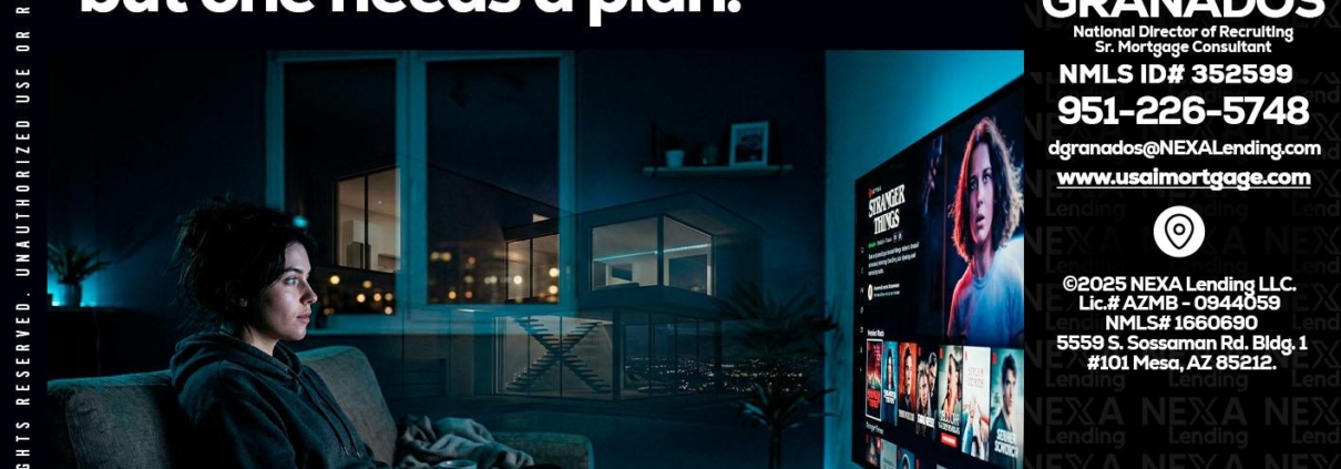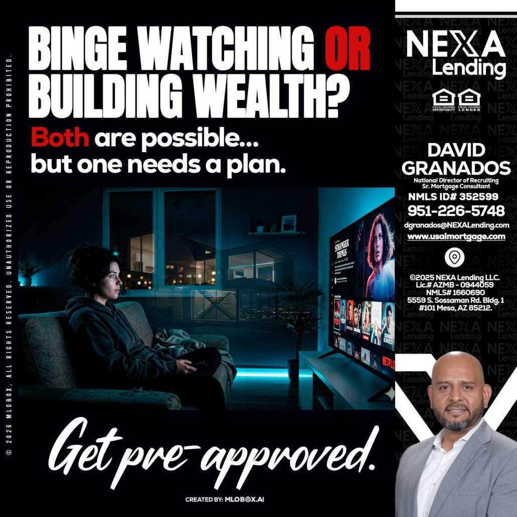 BINGE WATCHING - David Granados -National Director of Recruiting / Senior Mortgage ConsultantHi, my name is David Granados. I’m a Loan Officer with NEXA Lending LLC., offering personalized mortgage solutions, fast customized quotes, great rates and service with integrity.